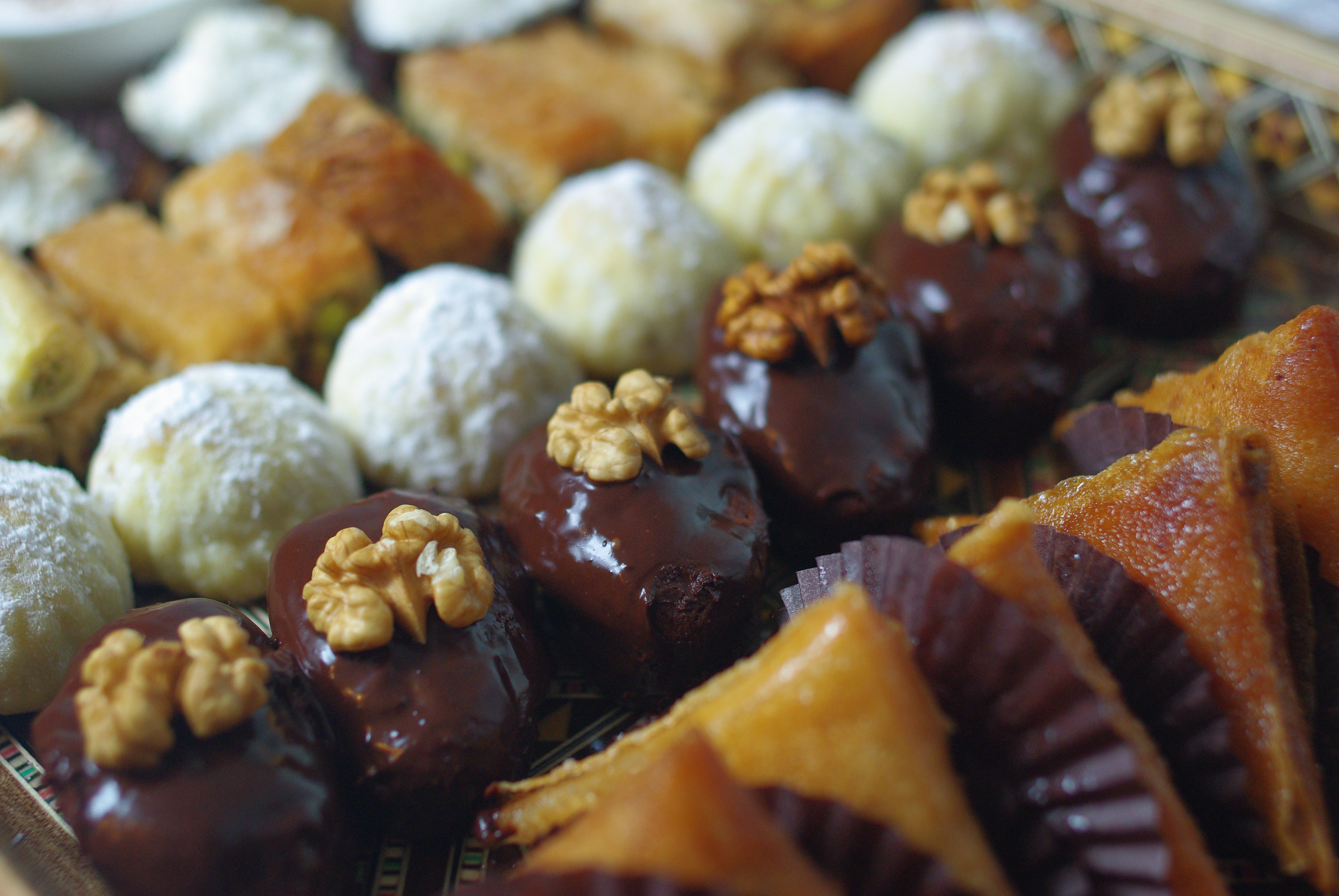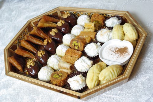 - différentes pâtisseries syriennes aux pistaches, achetées ! (Tous les autres gâteaux sont faits maison)