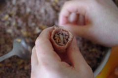 Faire bouillir de l’eau dans une marmite. Mettre les kebbés dans un panier/passoire (une seule couche, ne pas les superposer), et les faire cuire dans l’eau bouillante. Je les mets dans un panier pour une question pratique : pouvoir les retirer rapidement dès que la cuisson est terminée, ce n’est pas une cuisson à la vapeur, les boulettes baignent bien dans l’eau.