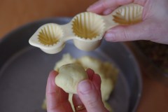 Mettre la boule dans le moule à maamoul, aplatir le dessus avec votre main. Puis taper (d’un coup sec) votre moule sur un torchon posé sur la table ou sur le sol, pour faire sortir le gâteau. Si vous n’avez pas de moule, vous pouvez utiliser une fourchette ou une pince spéciale pour faire des motifs à la main.
