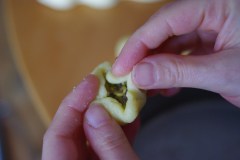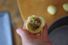 Mettre une bonne cuillère à café de la farce de pistache. Refermer en rabattant les bords (de façon à obtenir une boule)