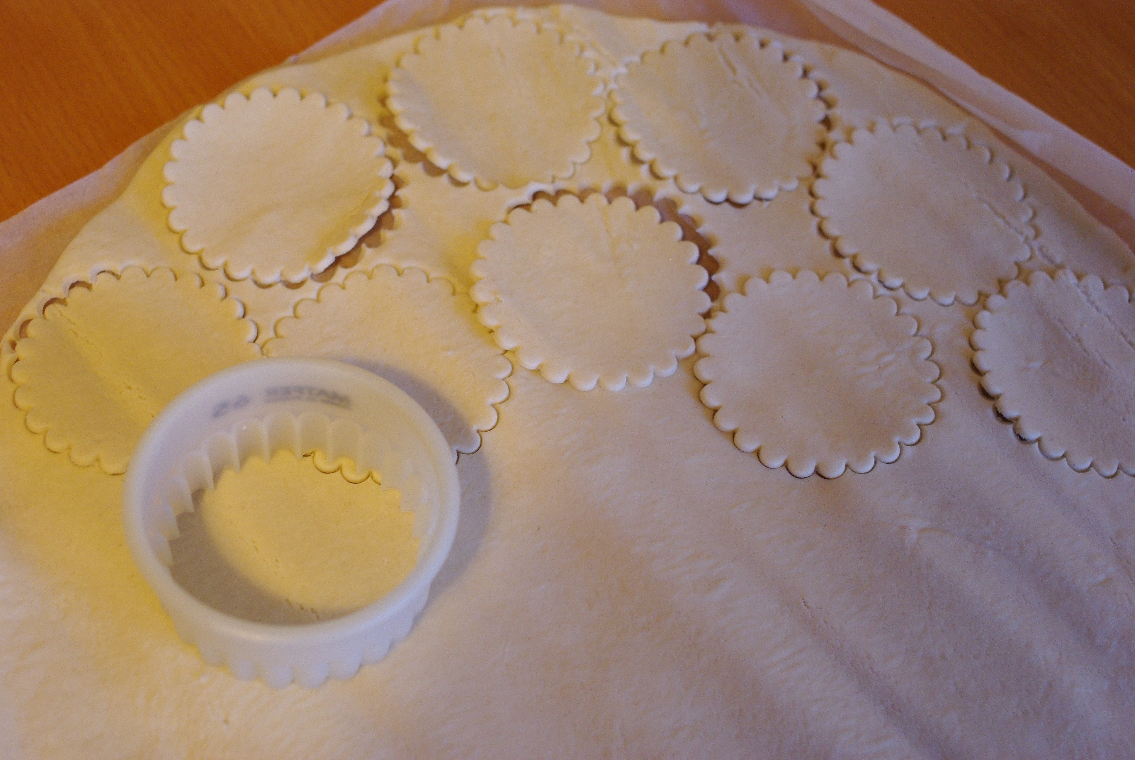 Avec un emporte-pièce (découpoir) couper des disques dans la pâte feuilletée étalée. Les disposer sur une plaque beurrée ou recouverte de papier sulfurisée
