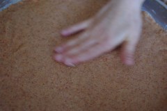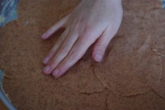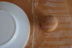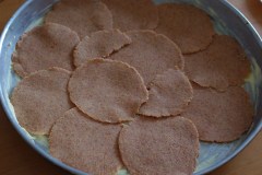 Presser la boule avec une assiette plate de façon à obtenir un disque (3). Ou le faire manuellement : aplatir une boule entre les paumes de vos mains mouillées. Disposer les disques sur un plateau rond très largement beurré (4) jusqu’à ce qu’il n’y ait plus d’espace libre.