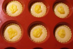 Dans chaque empreinte, verser de la pâte à muffins puis ajouter une cuillère à café de crème au citron au centre. Verser à nouveau de la pâte à muffins puis enfourner environ 20 min à 180°c.