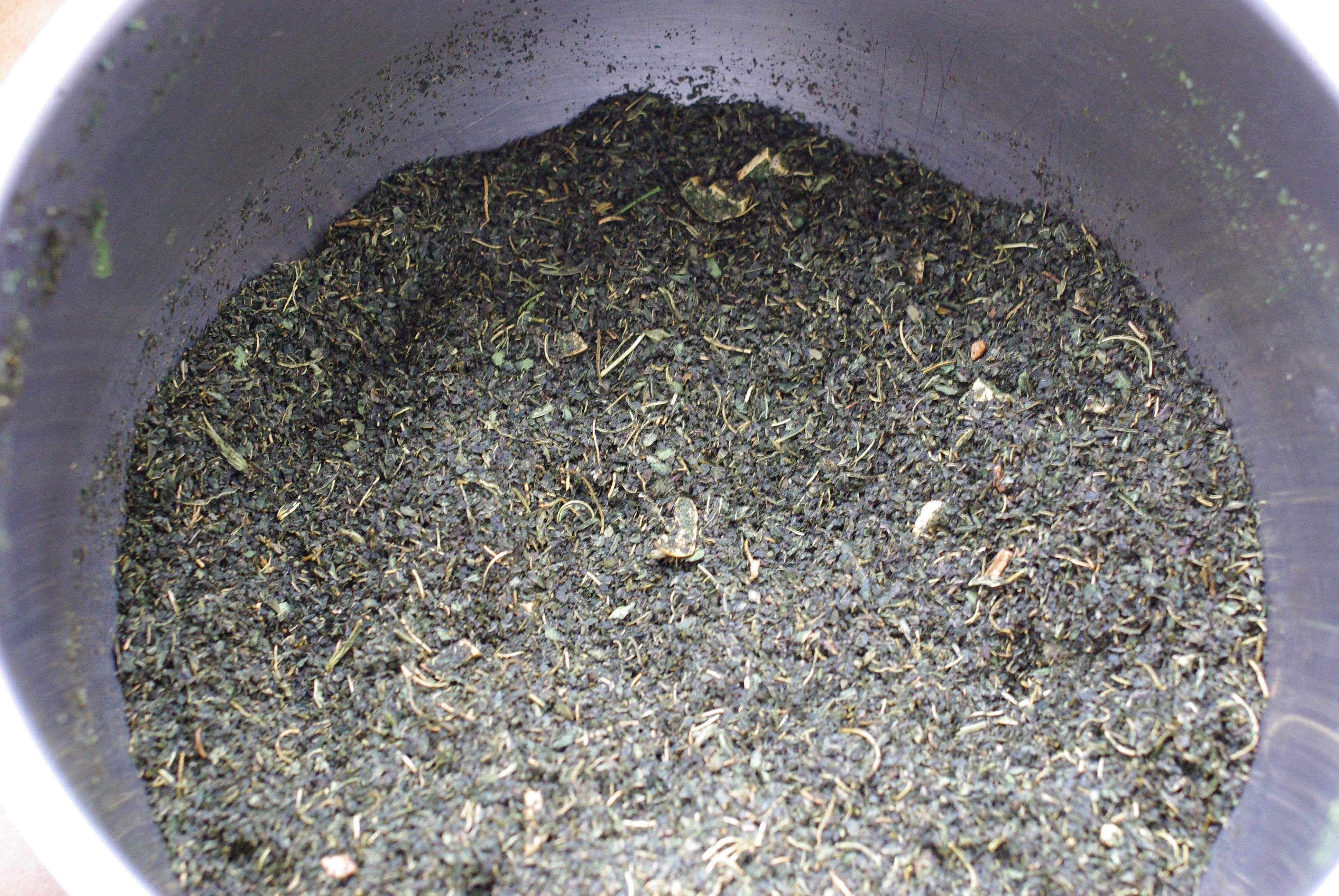 Mélanger constamment pendant 15 minutes, pour ne pas qu’elle brûle, jusqu’à ce qu’elle prenne une couleur verte foncée. Cette étape permet d’ôter la texture gluante de la corète.