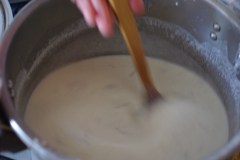 Sur feu moyen, mélanger constamment avec une cuillère en bois jusqu’au premier bouillon (pas plutard car sinon le yaourt risque de se séparer). Le yaourt va s’épaissir.