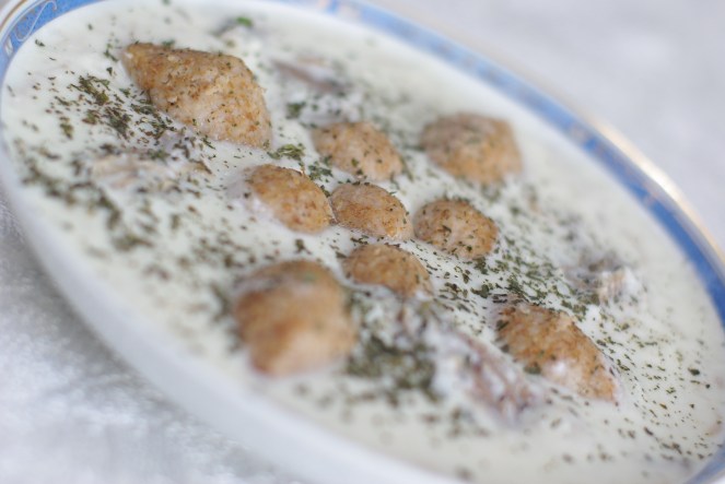 4. Autre différence : on met le yaourt à bouillir (après lui avoir ajouté 2 cuillères de maïzena, un peu d’huile d’olive et un oeuf brouillé… cela l’empêchera de « casser » ou tourner à la chaleur) . une fois qu’il commence à bouillir, y plonger les boulettes de kebbé une vingtaine de minutes, après leur avoir fait un petit trou avec la pointe d’une allumette … histoire d’empêcher la dilatation de l’air enfermé dedans de les faire exploser.