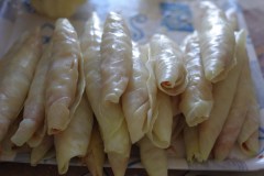 Prendre une feuille, poser la farce en boudin sur la largeur, aux 2/3 de la feuille. Puis l’enrouler (pas de pliage sur les côtés comme pour la feuille de vigne)
