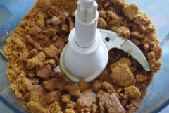 Mixer les biscuits (spéculoos) grosièrement. Ajouter le beurre fondu et mixer à nouveau.