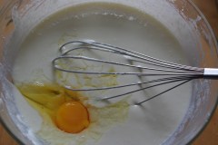 Puis ajouter les oeufs un à un en mélangeant entre chaque oeuf. Verser la moitié de la préparation dans le moule à charnières, ajouter les fruits rouges (en quantité suffisante pour former une couche) puis verser le restant.