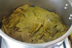 Laver les feuilles de vigne fraîchement cueillies puis les mettre dans un faitout, les couvrir d’eau et laisser bouillir (ou faire bouillir de l’eau puis plonger les feuilles), et laisser environ 3 à 5 minutes après le premier bouillon (ne pas laisser trop longtemps sinon les feuilles risquent de se déchirer). Dès que vous pouvez retirer la queue c’est prêt. Egoutter.