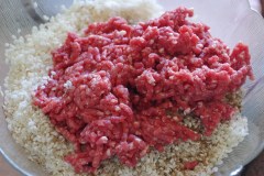 Laver le riz, l’égoutter, ajouter le sel, le b’har et la viande hâchée et un petit verre d’eau. Puis malaxer le tout. Réserver.