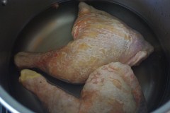 Mettre la viande (2 cuisses de poulet pour moi) dans un faitout, couvrir d’eau et porter à ébullition. Jeter le jus de cuisson et laver la viande.Reserver.
