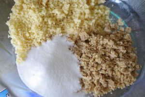 Mélanger la poudre d’amandes avec le sucre glace et les noix hâchées