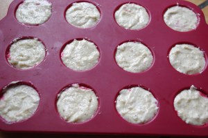 Verser un peu de pâte dans le fond des empreintes, mettre une petite cuillère de purée de framboises au centre, puis couvrir avec le reste de la pâte.