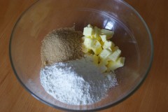 Préparer l’appareil à crumble : dans un saladier, mélanger la farine, la cassonade et le beurre (ramolli) coupé en dés, de façon à obtenir une semoule grossière (sabler la pâte : prendre du mélange dans vos mains et les frotter l’une contre l’autre).