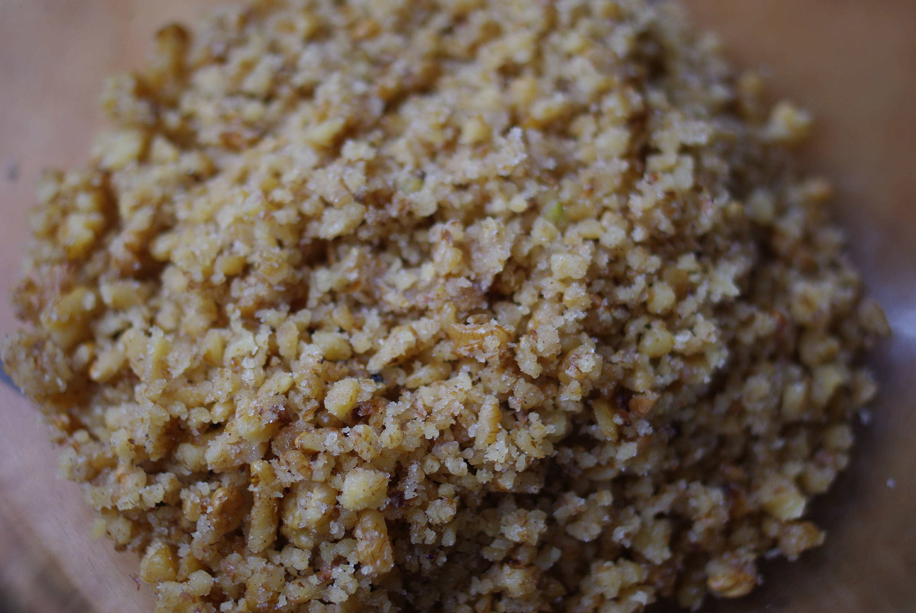 Hâcher les noix (moyennement) au hachoir, puis ajouter le beurre fondu, le sucre et la canelle.