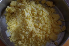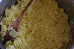 La veille, Mélanger la semoule et la farine avec le beurre fondu. Couvrir et laisser reposer dans un endroit sec.