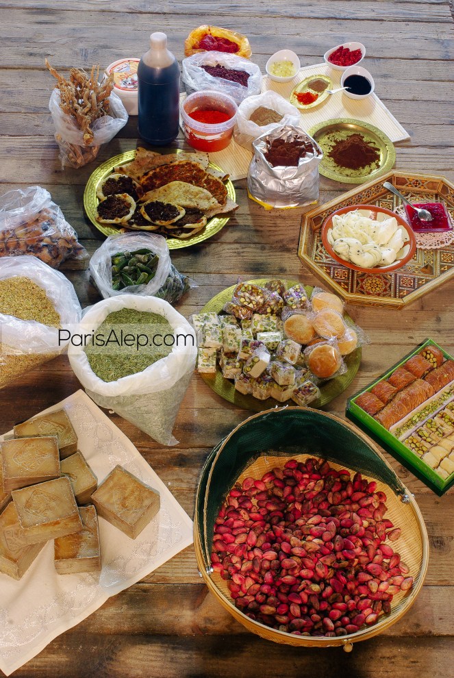 Evidemment, toutes les spécialités d’Alep ne figurent pas ci-après, il manque par exemple le fameux Zaatar (Mélange d’épices à base de thym, sésame, sumac,…). Dans le listing suivant, vous trouverez donc des produits typiquement alépins, ou plus globalement syriens ou encore moyen-orientaux.