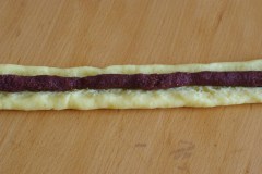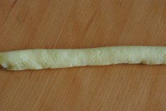 Former des rouleaux avec la pâte de semoule, faire une fente et introduire un boudin de pâte de dattes. Refermer en pinçant les bords. Rouler (le rouleau va s’allonger).
