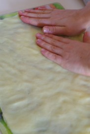 Ajouter la farce sur un côté, sur toute la largeur (la pâte aura déjà eu le temps de refroidir sinon attendre un peu). Rouler (faire 2 tours), couper le premier roulé obtenu. Répéter l’opération. On obtient 4 roulés par plateau (vous pouvez au préalable couper 4 rectangles puis ensuite former vos roulés).