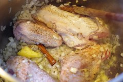 Dès que les oignons commencent à coller au fond (au bout de 5 min environ, ne pas attendre que le poulet se colore), ajouter de l’eau de façon à recouvrir la viande.  Ajouter la poignée de pois chiche puis faire cuire 15 minutes environ à la cocotte.