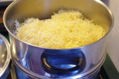 Dès que la vapeur s’échappe de la rechta, la retirer et la retravailler (passer et soulever entre les doigts) dans une jatte (mouiller légèrement si nécessaire). Repasser à la vapeur.
