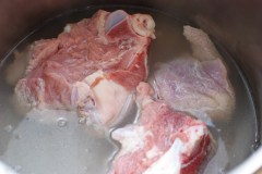 Faire cuire la viande à la cocotte minute, la recouvrir d’eau, saler et poivrer.