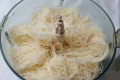 Dans le récipient d’un robot, mettre les 250 g de pâte, et mixer très finement (de façon à obtenir de petites vermicelles)