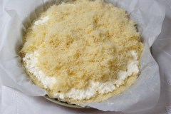 Ajouter un peu de lait pour humidifier et ramasser la pâte et déposer la moitié dans le moule. Bien aplatir avec les mains. Etaler ensuite le fromage par dessus sur toute la surface. Enfin déposer l’autre moitié de pâte, égaliser la surface.