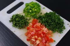 Pendant ce temps, hâcher le persil et la menthe, couper la tomate et le poivron en petits dés. Ôter la peau de l’aubergine (elle se décolle très facilement).