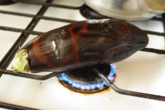 Retourner l’aubergine dès que la peau commence à brûler, répéter cette opération régulièrement. Lorsque celle-ci est complètement  « brûlée » de tous les côtés, retirer l’aubergine du feu (penser à nettoyer votre plaque après ;-)). Laisser refroidir quelques minutes.