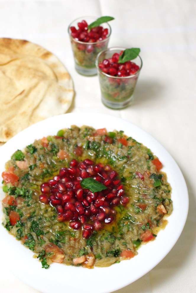 Qui dit grenade, dit aubergine (étonnante association, mais c’est une tuerie) ! Et qui dit aubergine dit Mtabbal ou encore mieux Baba Ghannouj (aussi noté Ghanoush) [بابا غنوج ] ! Ce dernier est une spécialité de Damas (la capitale de la Syrie), et c’est aussi un dip d’aubergines grillées mais point de tahineh ; de la mélasse de grenade, des légumes et herbes viennent se lier à l’aubergine. Finalement, c’est un peu entre une salade et un dip.