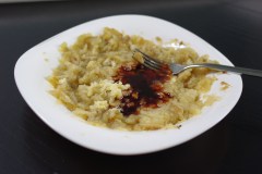 Ecrasez à la fourchette cette chair assez longtemps qui devient une purée blanche, j’ajoute dedans un yaourt ou deux, un jus de citron, une belle cuillère de sauce tahini et deux gousses d’ail écrasées dans le pilon avec du sel!