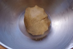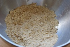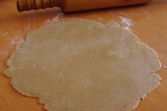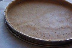 Mélanger les 2 farines et le sel dans un saladier. Ajouter le beurre en morceaux et travailler du bout des doigts jusqu’à l’obtention d’un mélange granuleux. Ajouter alors l’eau petit à petit, en travaillant la pâte avec la paume de la main jusqu’à l’obtention d’une pâte. Etaler la pâte sur un plan de travail fariné et garnir un moule beurré (j’ai utilisé un cercle à tarte de 24 cm). Piquer à l’aide d’une fourchette. Réserver.