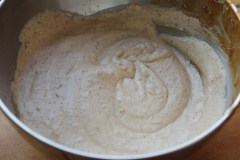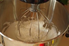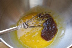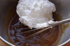 Séparer les blancs des jaunes d’oeufs. Verser la préparation aux châtaignes dans un saladier et ajouter les jaunes d’oeufs, en mélangeant bien. Monter les blancs en neige très ferme et les incorporer à leur tour à la préparation.