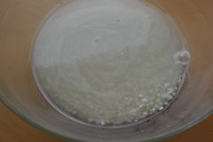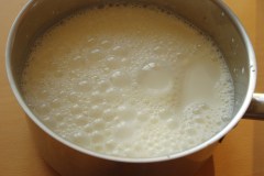 Rincer le riz et le tremper dans de l’eau chaude (bouillante) pendant 1h, afin qu’il gonfle. Dans une casserole, mettre à le lait à bouillir.