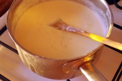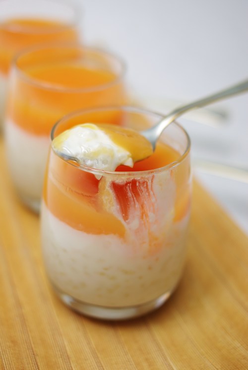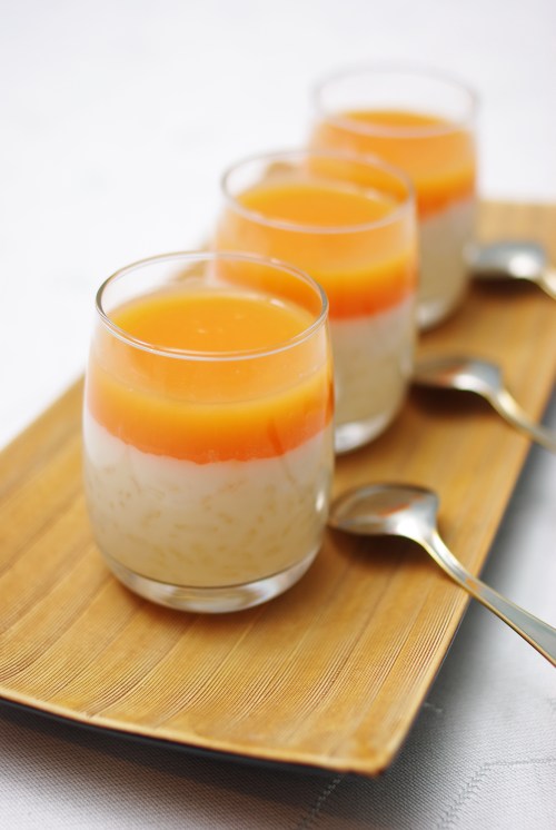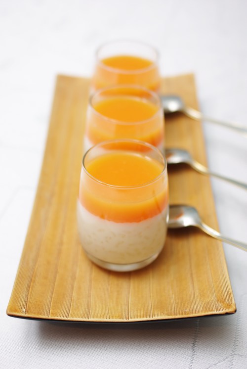 Verser délicatement, à la cuillère la balouza sur chaque verrine (la balouza étant bien chaude, si on verse de trop haut ou trop vite, le riz au lait va se fissurer).