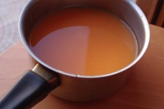 Pendant ce temps, délayer la maïzena dans un peu d’eau.  L’ajouter au jus alors qu’il est chaud. Mélanger sans cesse jusqu’à ce que le jus s’épaississe. Ajouter le sucre et retirer du feu.