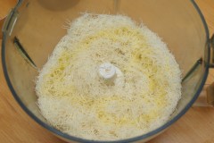 Dans un robot, hâcher la knafé, jusqu’à obtenir de petites vermicelles. Ajouter le beure fondu, mélanger.