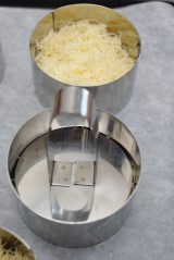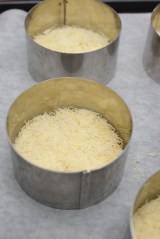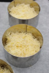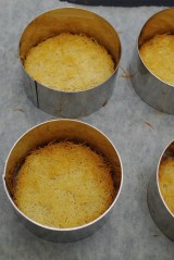 Dans des cercles (de 8 cm de diamètre), disposer la pâte de knafé (diviser la pâte en 5 parts). Tasser avec le poussoir à cercle. Mettre au four à 180 °c. Lorsque le dessus est doré, sortir du four.