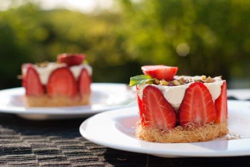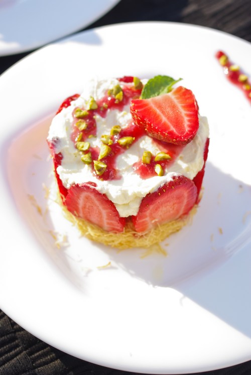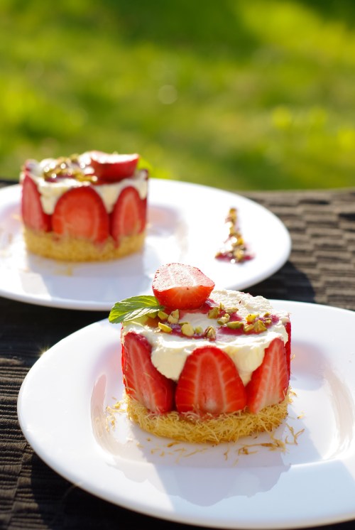 Au départ, je voulais faire un simple tiramisu aux fraises, mais en y réfléchissant un tiramisu aux fruits rouges avait déjà été publié sur le blog. Donc pour changer un  peu, j’ai pensé à lui donner une touche syrienne… Finalement, je me suis assez éloignée du tiramisu, et j’ai plutôt obtenu un dessert semblable dans la forme à de mini fraisiers mais aux saveurs orientales : une base de knafeh (cheveux d’ange ou kadaïf) imbibée de sirop et coulis de fraises,  garnie de crème de mascarpone sucrée au miel et fraises, et quelques pistaches pour parfaire le côté oriental !