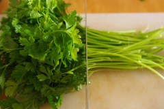 Pendant ce temps, laver, égoutter le persil. Couper les tiges (on ne garde que le feuillage). Hâcher très finement au couteau (avec un hâchoir, le résultat est pas terrible)