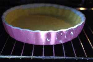 Foncer un moule avec la pâte à tarte. La piquer. Enfourner dans un four préchauffé à 180°C (une vingtaine de minutes).