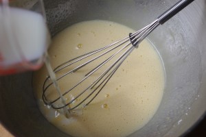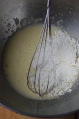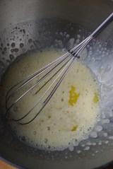 Fouetter vivement les oeufs entiers, le jaune, le sucre et le sel. Incorporer le beurre fondu tiédi, puis la farine.