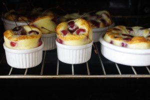 Enfourner dans un four préchauffé à 180°C, et faire cuire 40 minutes pour un grand plat, 20 à 25 minutes pour les petits (photo de droite : en fin de cuisson, juste avant que les clafoutis retombent…).