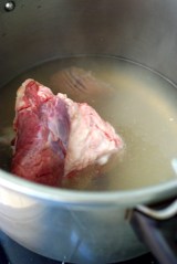 Dans un faitout mettre la viande et la couvrir d’eau. Faire bouillir, puis jeter le liquide et laver la viande. Recouvrir d’eau, saler, poivrer et faire cuire mais pas complètement (à la cocotte-minute).