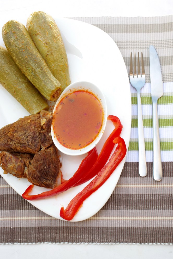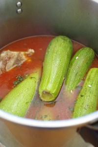 Lorsque la viande est presque cuite, ajouter au bouillon de viande, le concentré de tomates, le jus de citron, l’ail (des gousses d’ail entières ou bien de l’ail pilé), la menthe et le sel. Disposer les courgettes dans cette sauce, par dessus la viande. Compléter avec de l’eau pour recouvir le tout.