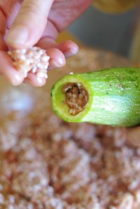 Farcir les courgettes mais pas complètement, et ne pas presser  la farce car le riz va gonfler pendant la cuisson et les courgettes risqueraient d’éclater.