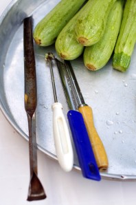 Les courgettes sont évidées à l’aide d’un ustensile indispensable à la cuisine syrienne : une « mahfara » [ محفرة ] ou un évide légume. Il en existe de plusieurs sortes : avec une lame demi-cylindrique plus ou moins fine, et plus ou moins longue, mais aussi un »magique » (le 2ème à gauche sur la photo ci-contre) qu’on fait pivoter dans la courgette et il en ressort une torsade de chaire. Ce dernier est plus facile d’utilisation car il ne « casse » pas les légumes.