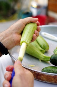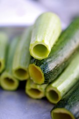 Laver les courgettes, couper les extrémités. Puis les évider à l’aide d’un évide courgette. Retirer une première fois le coeur. Puis répeter l’opération pour évider les bords. C’est un peu délicat, il faut  faire attention à ne pas casser la courgette. (Sur les photos ci-dessous, les mains de mon père le spécialiste !)